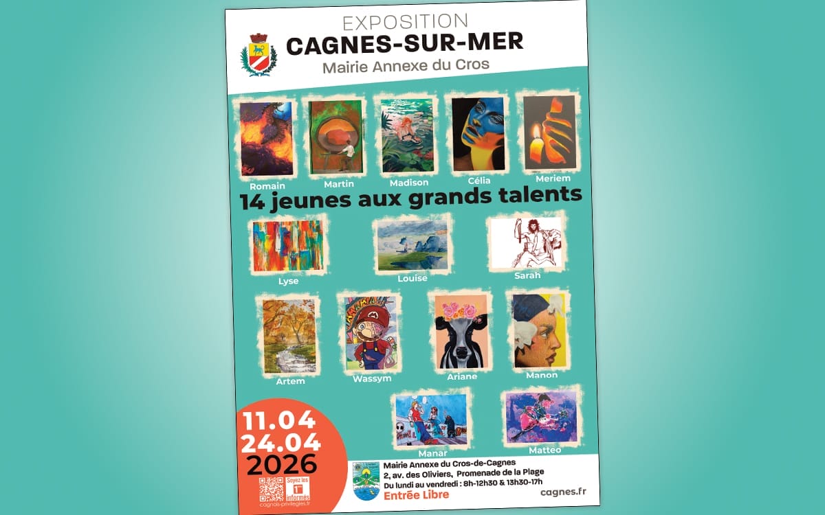 La mairie annexe du Cros-de-Cagnes poursuit ses expositions en accueillant les jeunes artistes, pour l’exposition temporaire « 14 jeunes aux grands talents » – du 11 au 24 avril 2026.