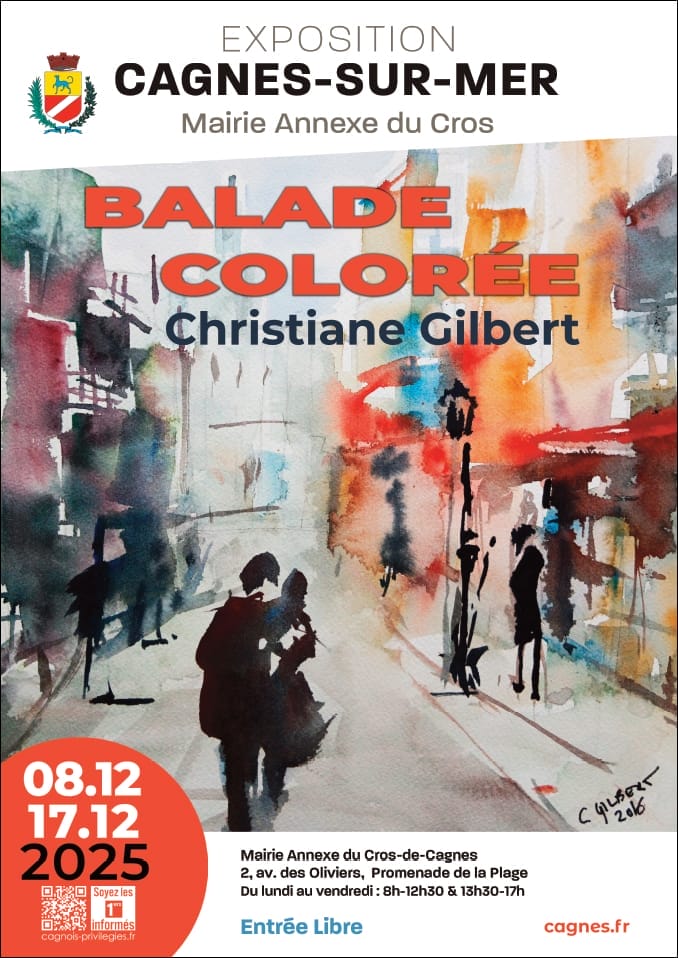 La mairie annexe du Cros-de-Cagnes poursuit ses expositions en accueillant l’artiste aquarelliste Christiane GILBERT pour l’exposition temporaire « BALADE COLOREE » du 8 au 17 décembre 2025.