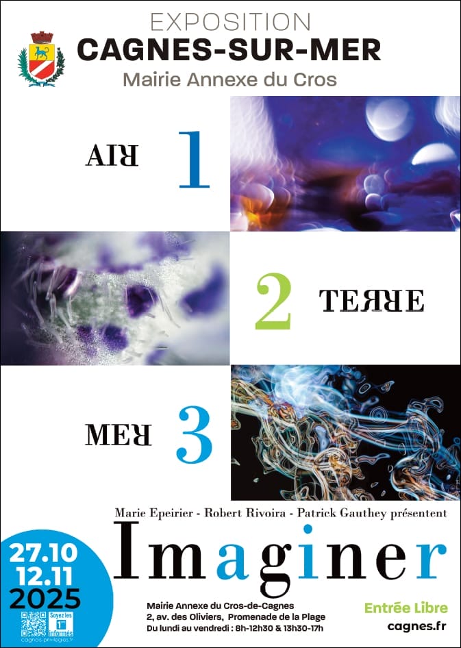 La mairie annexe du Cros-de-Cagnes poursuit ses expositions en accueillant les photographes Marie Epeirier – Robert Rivoira et Patrick Gauthey, pour l’exposition temporaire « Imaginer » – du 27 octobre au 12 novembre 2025.
