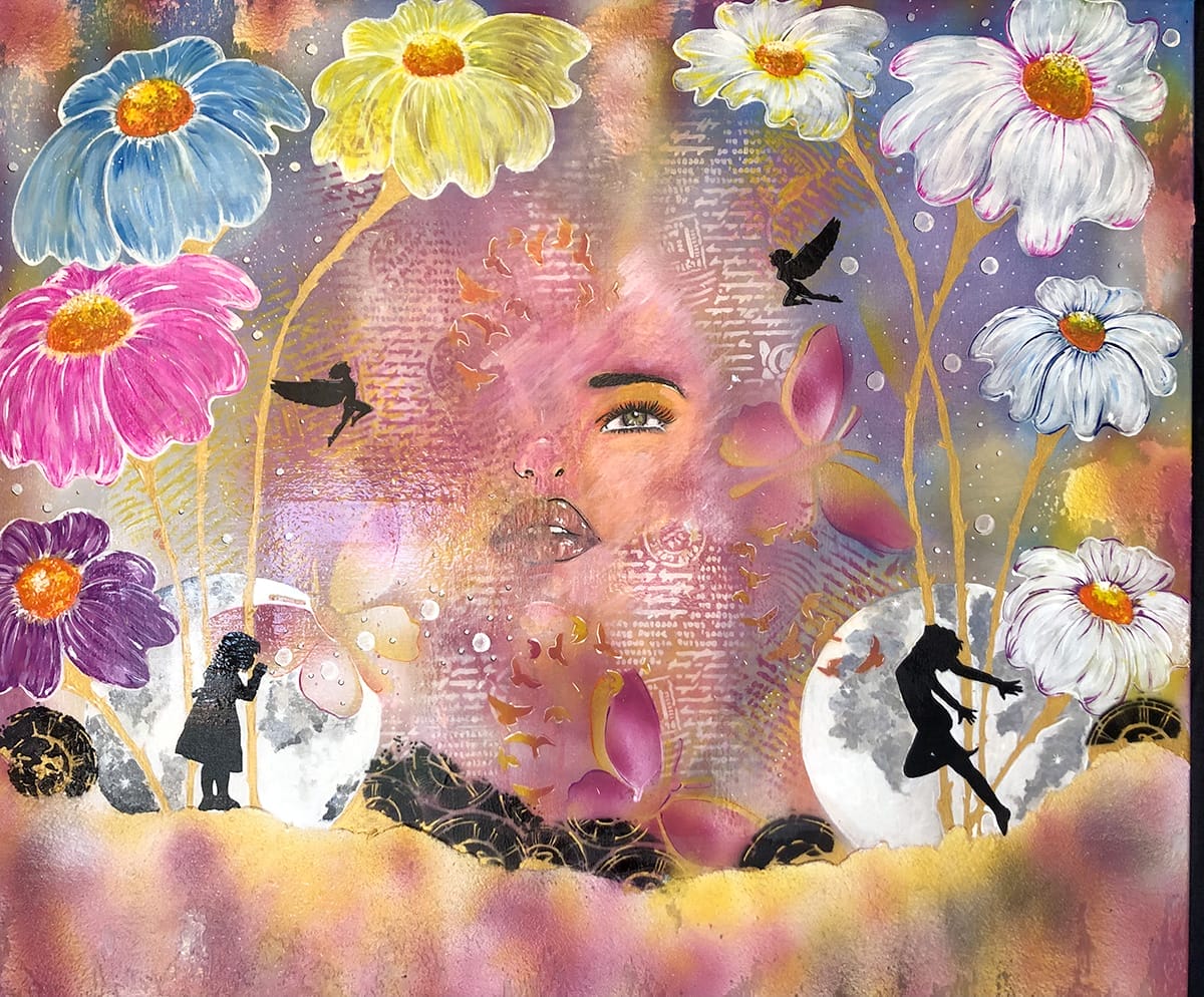 En 2024, Chantal se lance dans la peinture, une pratique qu’elle aborde de manière instinctive, sans s’inscrire dans un courant artistique particulier. Ses œuvres sont un mélange de ce que l’artiste voit, entend et ressent, exprimant son monde intérieur à travers des couleurs, des formes et des personnages.