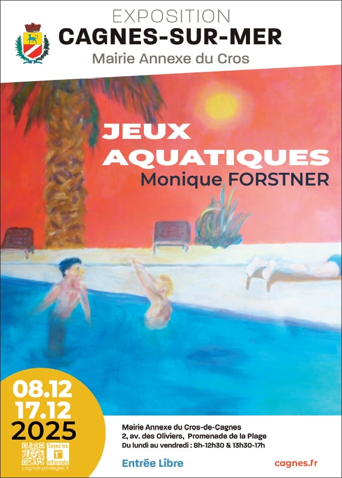 La mairie annexe du Cros-de-Cagnes poursuit ses expositions en accueillant l’artiste Monique Forstner pour l’exposition temporaire « Jeux Aquatiques », du 8 au 17 décembre 2025.
