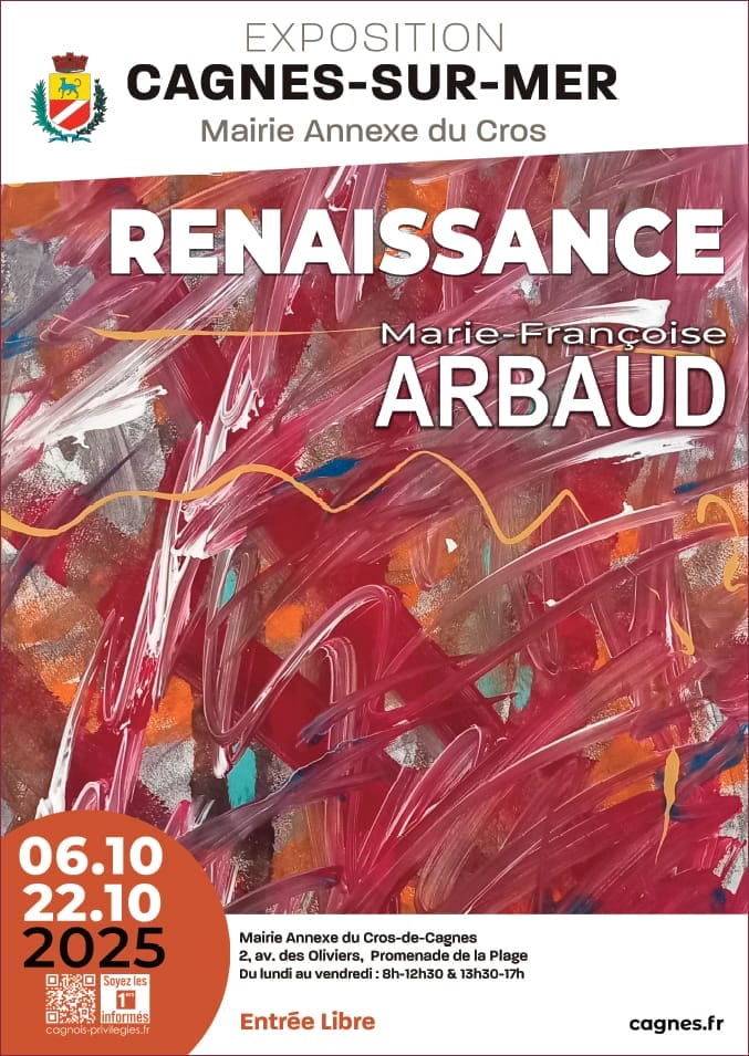 Pour cette nouvelle exposition, la mairie annexe du Cros-de-Cagnes accueille l’artiste peintre Marie-Françoise Arbaud pour l’exposition temporaire « Renaissance »du 6 au 22 octobre 2025.