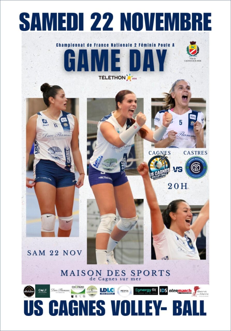 Samedi 22 novembre prochain à 20h, la Maison des Sports accueillera un temps fort du Championnat de France National 2 Poule A : US Cagnes Volley-ball reçoit Castres pour un match au sommet, placé sous le signe du Téléthon 2025.