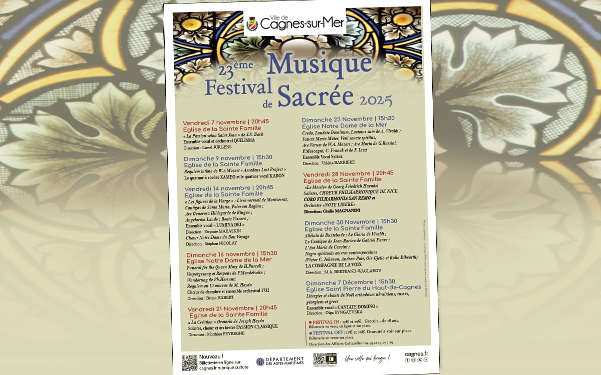 Retrouvez toute la programmation Festival IN, festival OFF Le 23e Festival de Musique Sacrée aura lieu du 7 novembre au 7 décembre. 9 concerts exceptionnels présentant les plus beaux morceaux du genre dans les églises de Cagnes-sur-Mer. Infos pratiques Festival IN : Tarif plein 15 € / réduit : 12€. Gratuit – de 18 ans Billetterie en […]