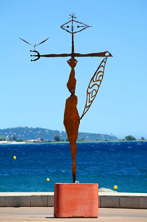 Aujourd’hui, c’est l’œuvre de Myrian Klein qui vient s’installer sur l’espace d’exposition annuelle : « La foule ». Une œuvre moderne et conceptuelle représentant des silhouettes en métal réfléchissant. Appartenant à l’école de Nice depuis 30 ans, l’artiste revendique cependant une certaine indépendance de sujet qui la lie aux grands problèmes de notre époque: environnement, incommunicabilité, métissage, surpopulation, pollution, perte d’identité sont traités par des séries éclectiques. Gageons que les jeux du soleil et de la mer sur ces silhouettes sauront captiver l’intérêt des promeneurs et des instagrameurs !