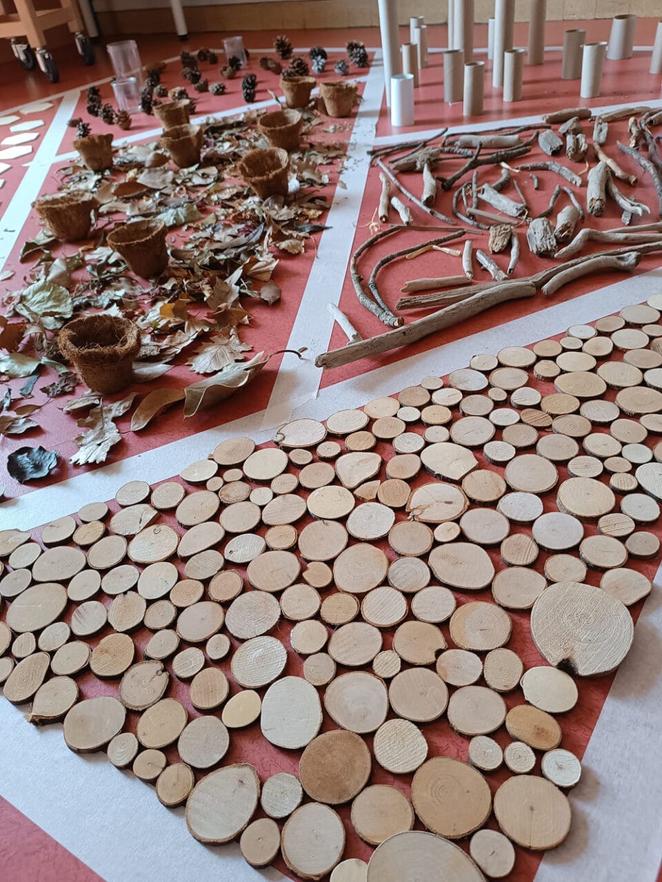 A l’intérieur, des zones de récupération sont mises à disposition des parents, professionnels et enfants pour y déposer ce qu’ils ont récolté en famille. Feuillages, bois, objets de récupération sont ensuite utilisés comme support d’activités. Ces matériaux simples et sensoriels sont utilisés dans nos jeux afin de favoriser la curiosité, la créativité et le respect.